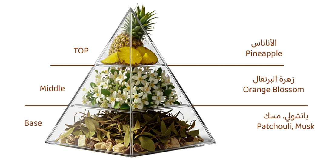 Madawi s’ouvre sur une note fruitée d’ananas, suivie d’un cœur délicat de fleur d’oranger. Le fond combine patchouli et musc pour une personnalité raffinée, douce et enveloppante.