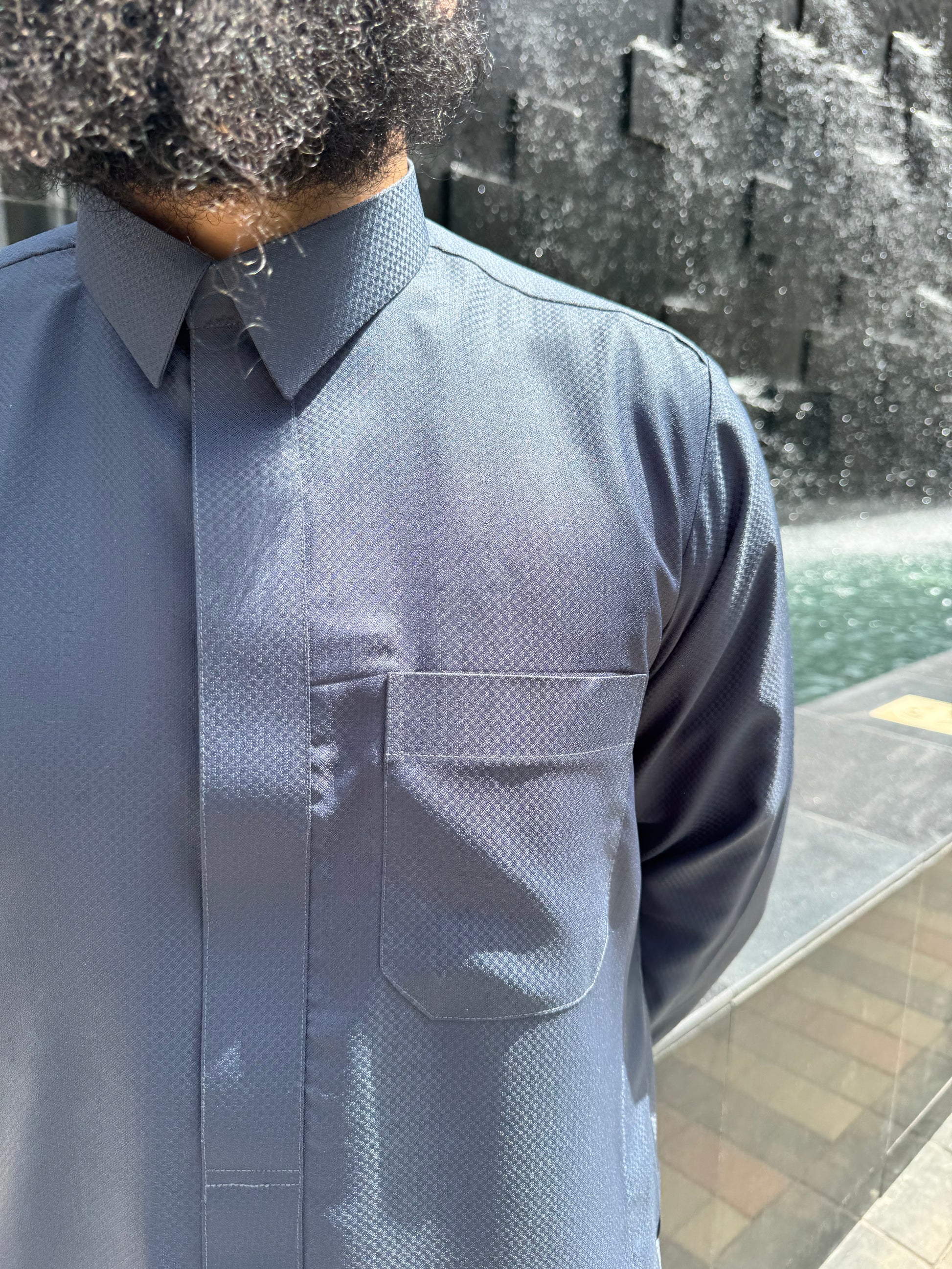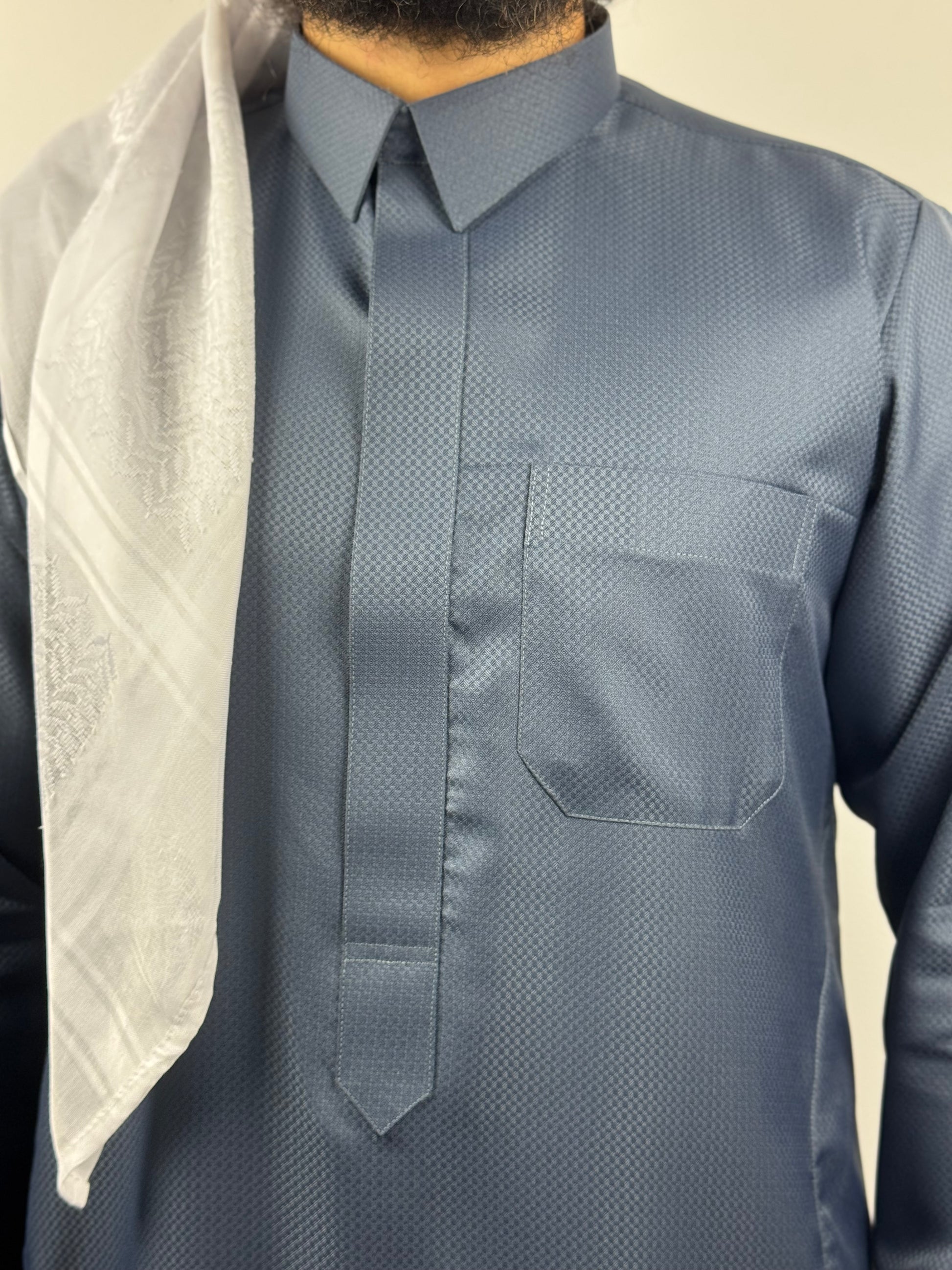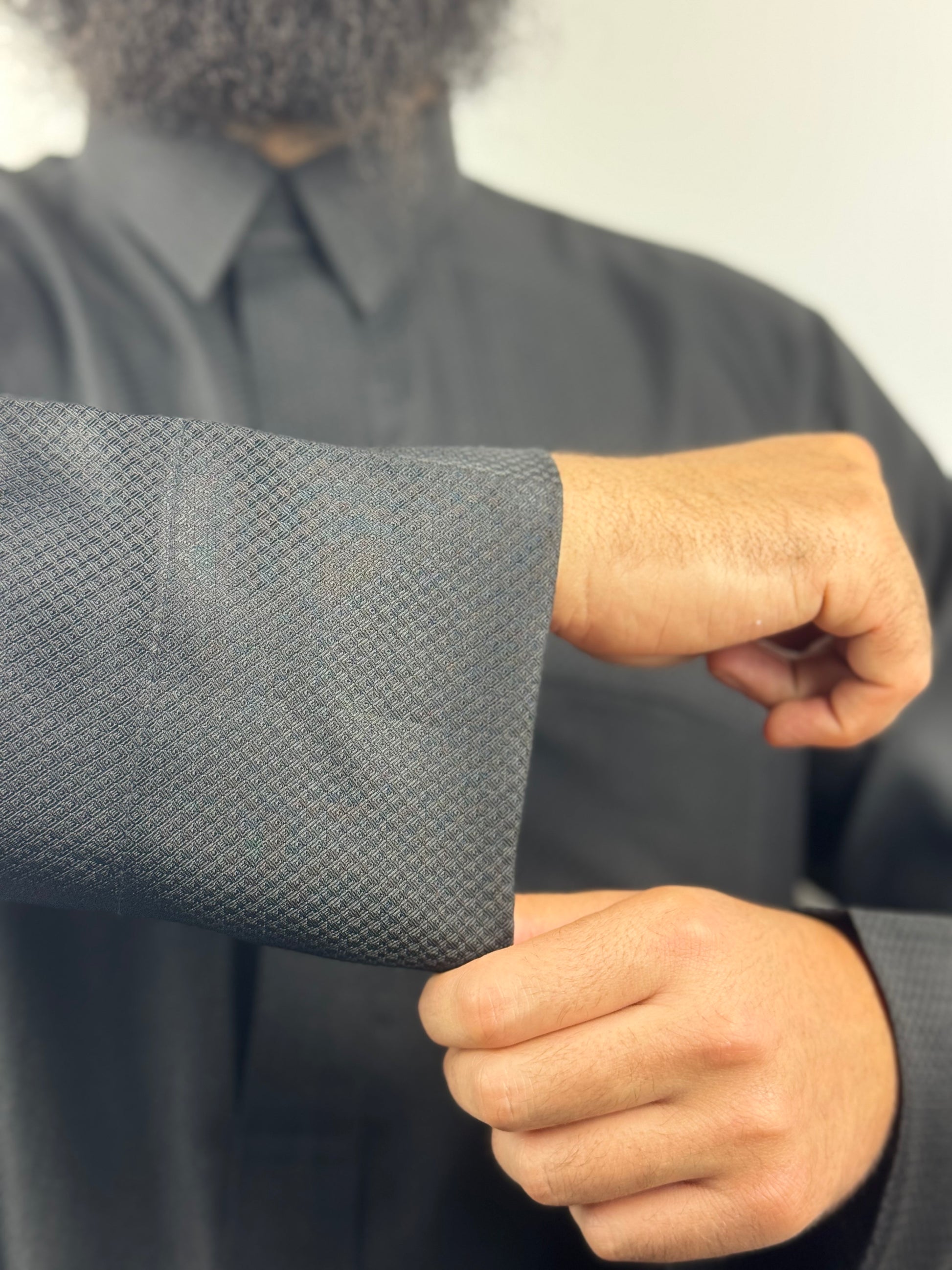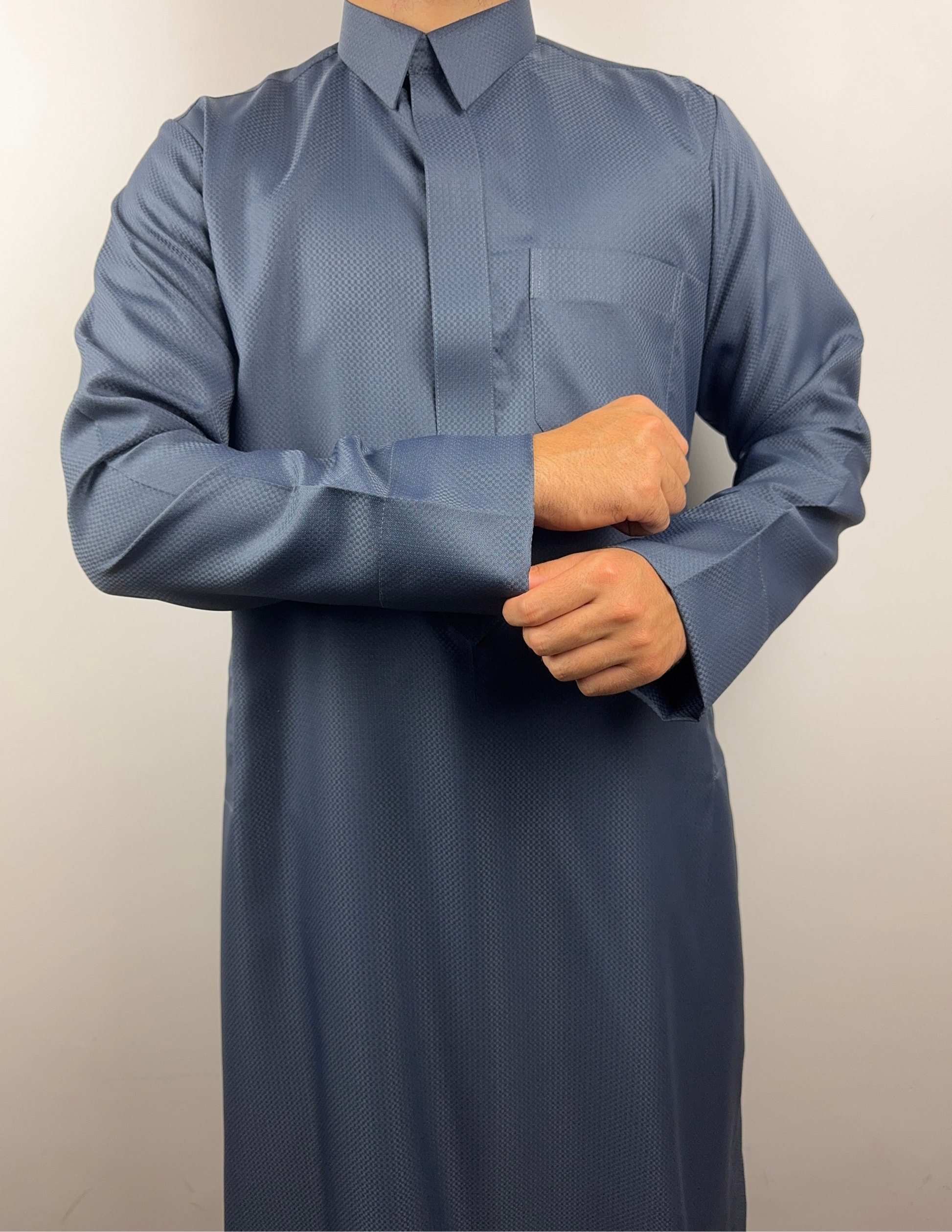 Un Qamis d’exception confectionné dans un tissu coréen haut de gamme, avec un motif gaufré en forme de losanges.