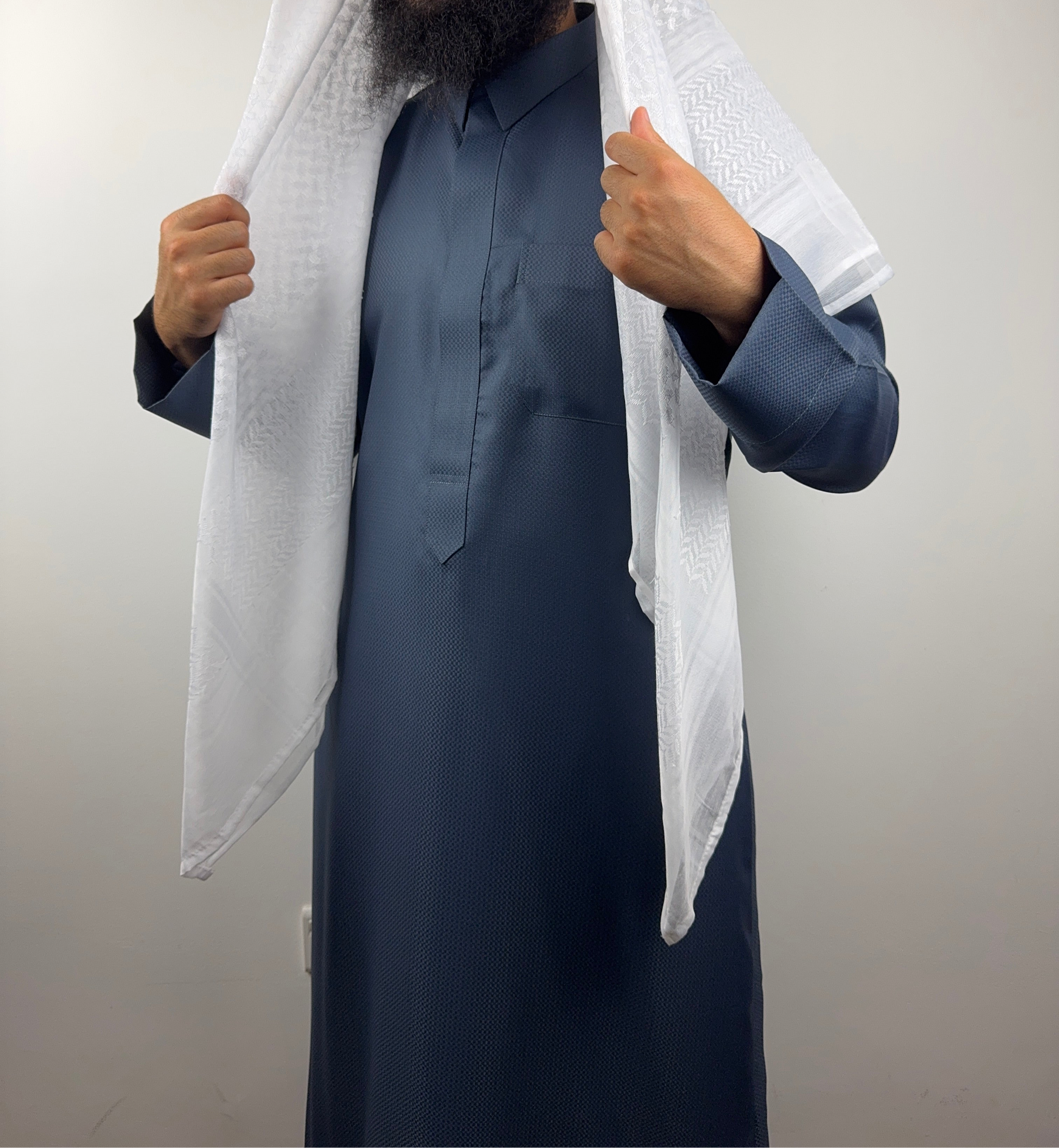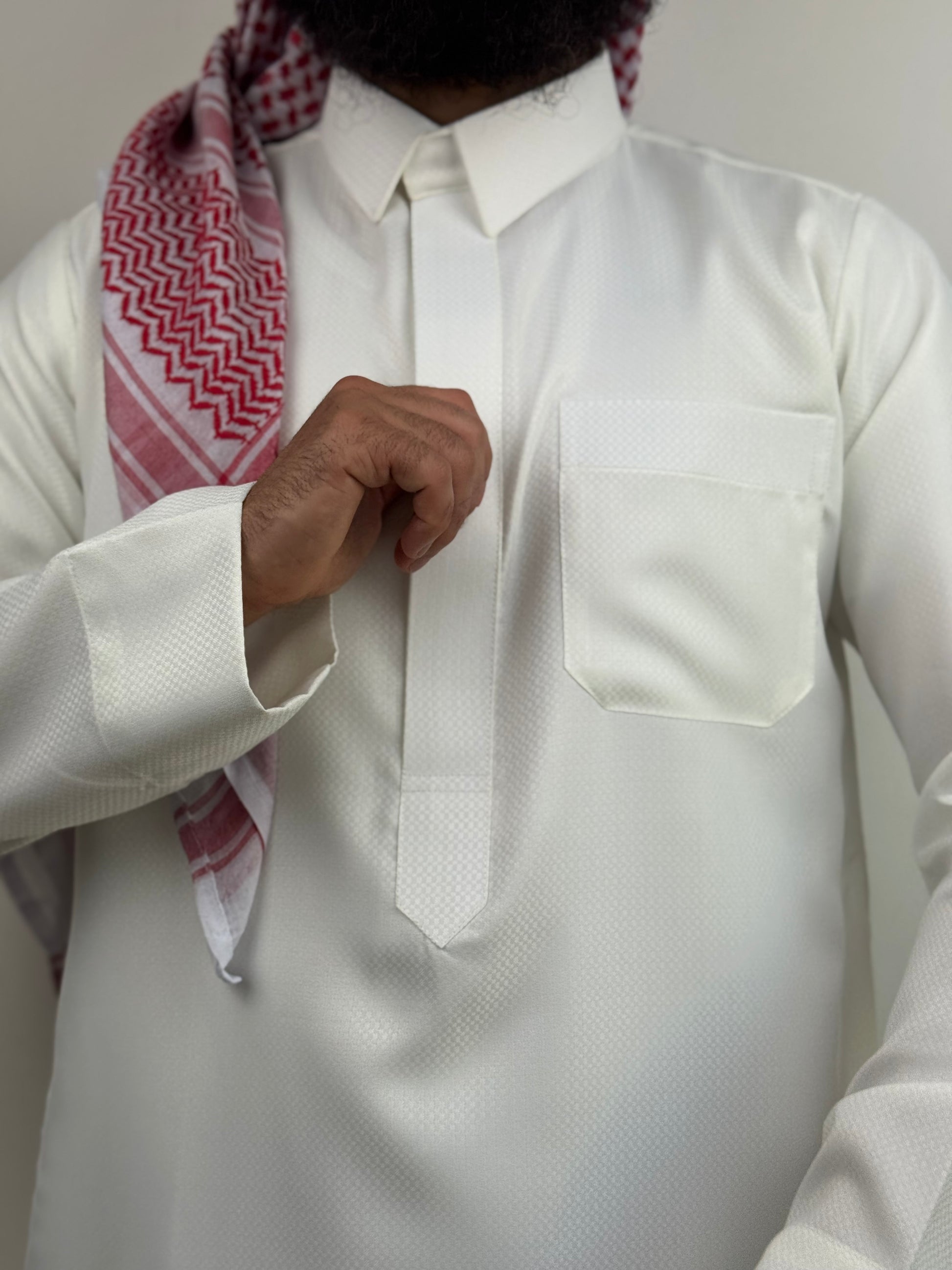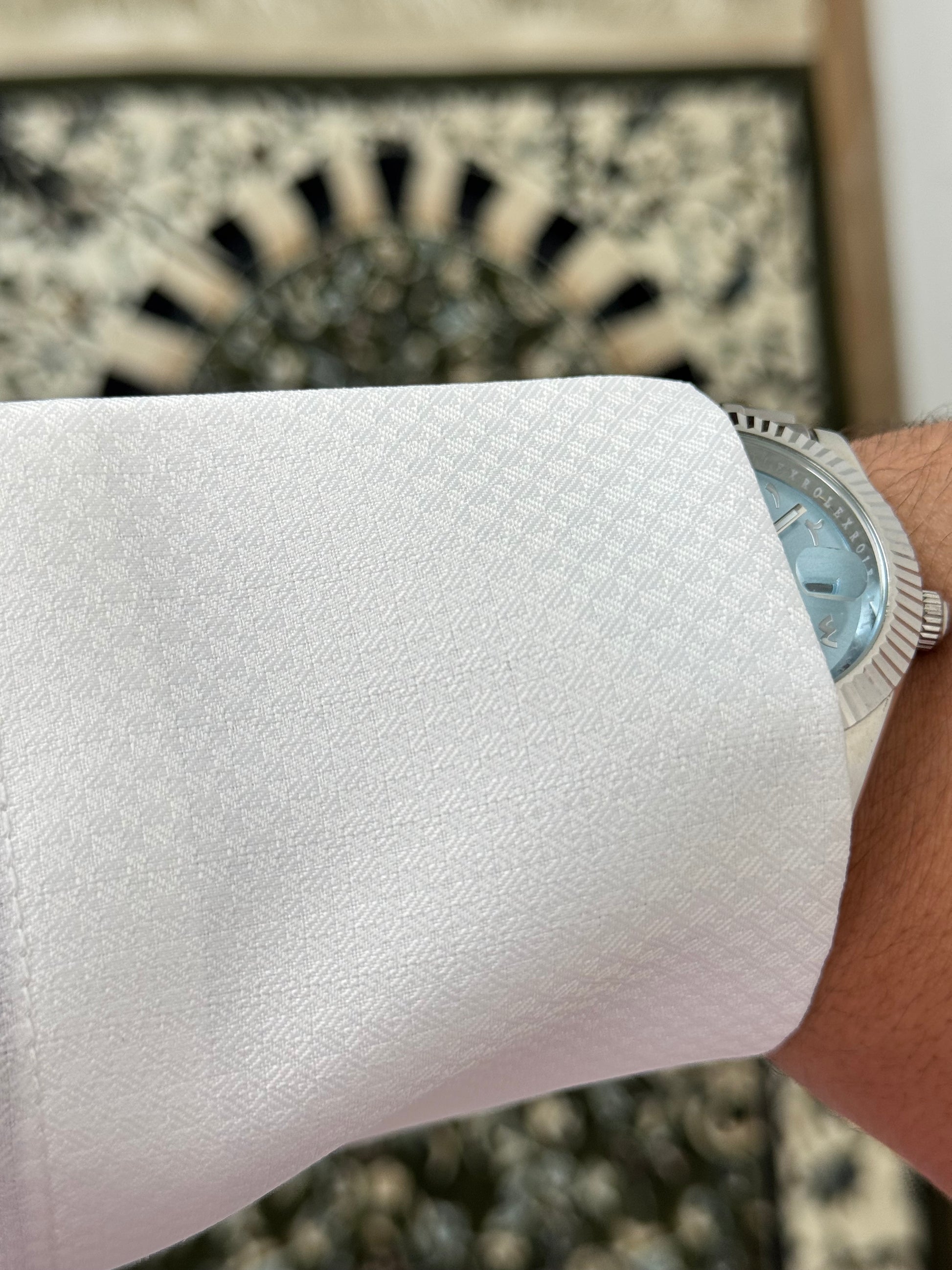 Un Qamis d’exception confectionné dans un tissu coréen haut de gamme, avec un motif gaufré en forme de losanges.