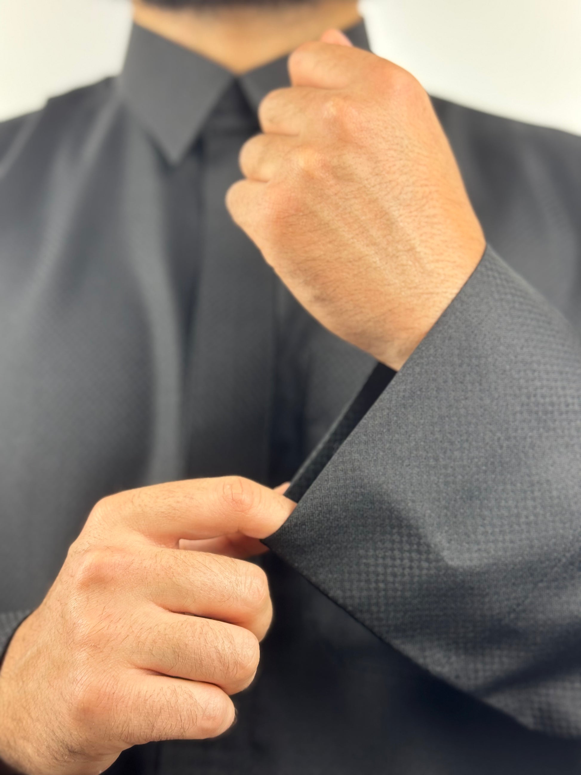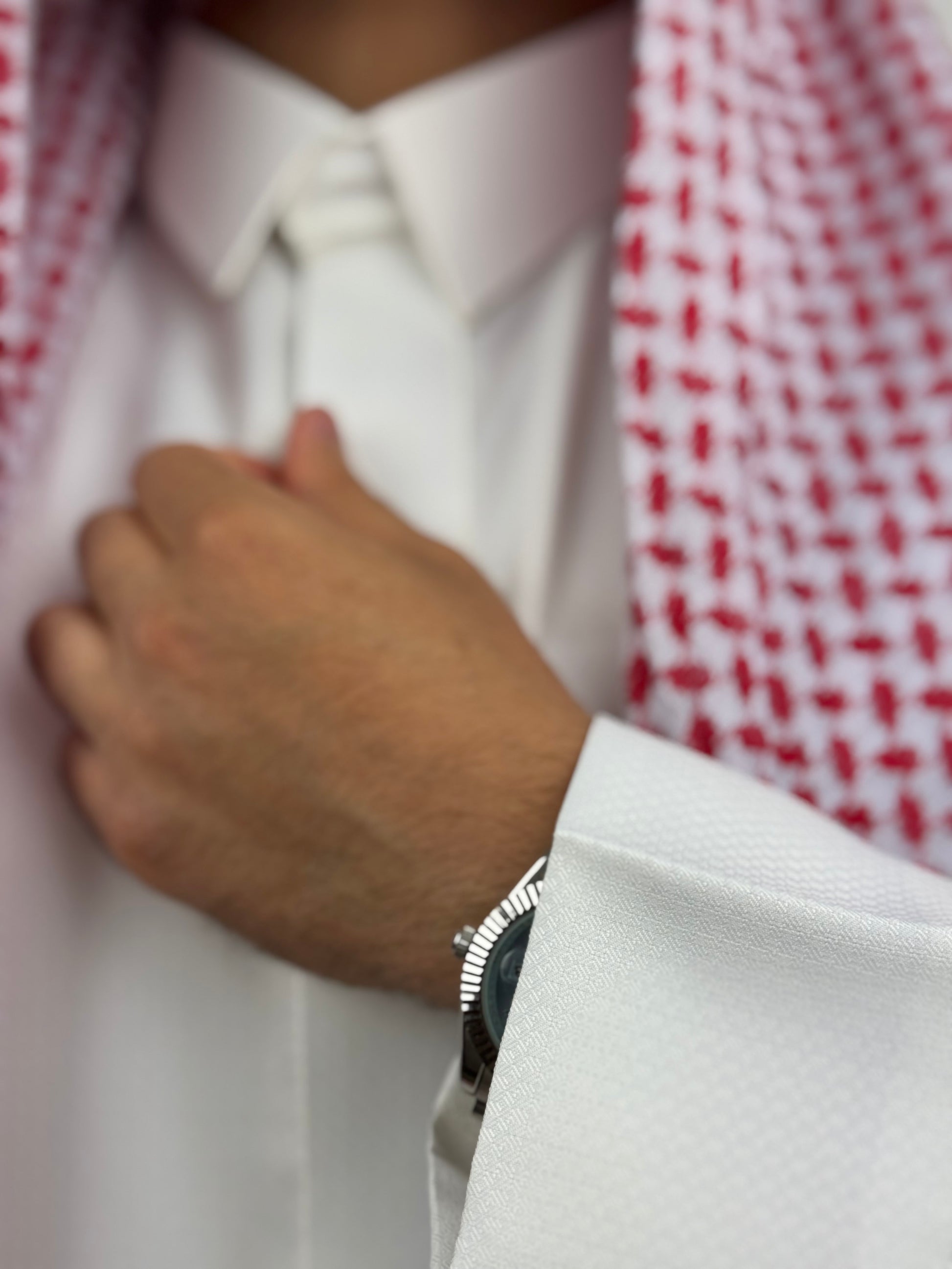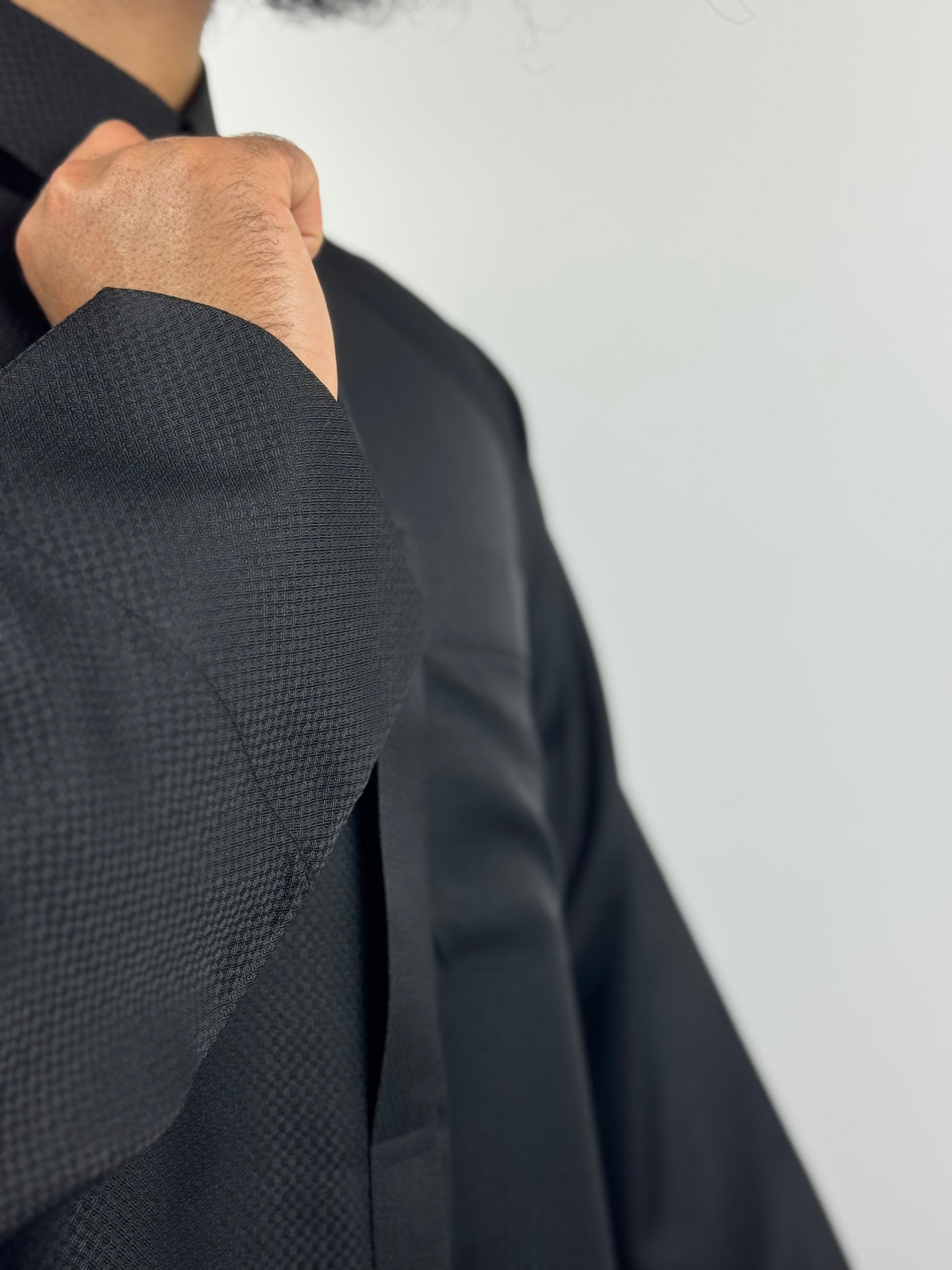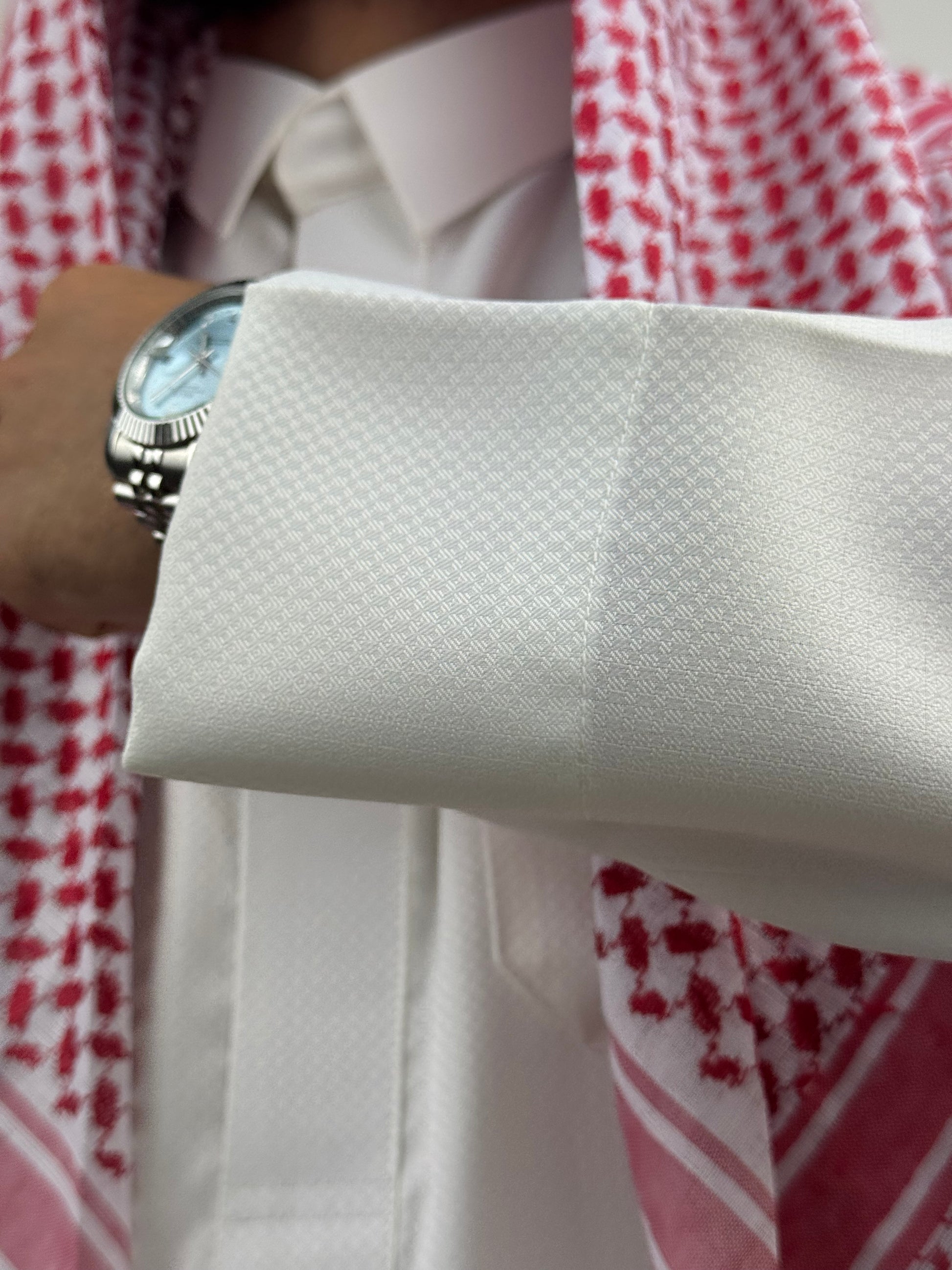 Un Qamis d’exception confectionné dans un tissu coréen haut de gamme, avec un motif gaufré en forme de losanges.
