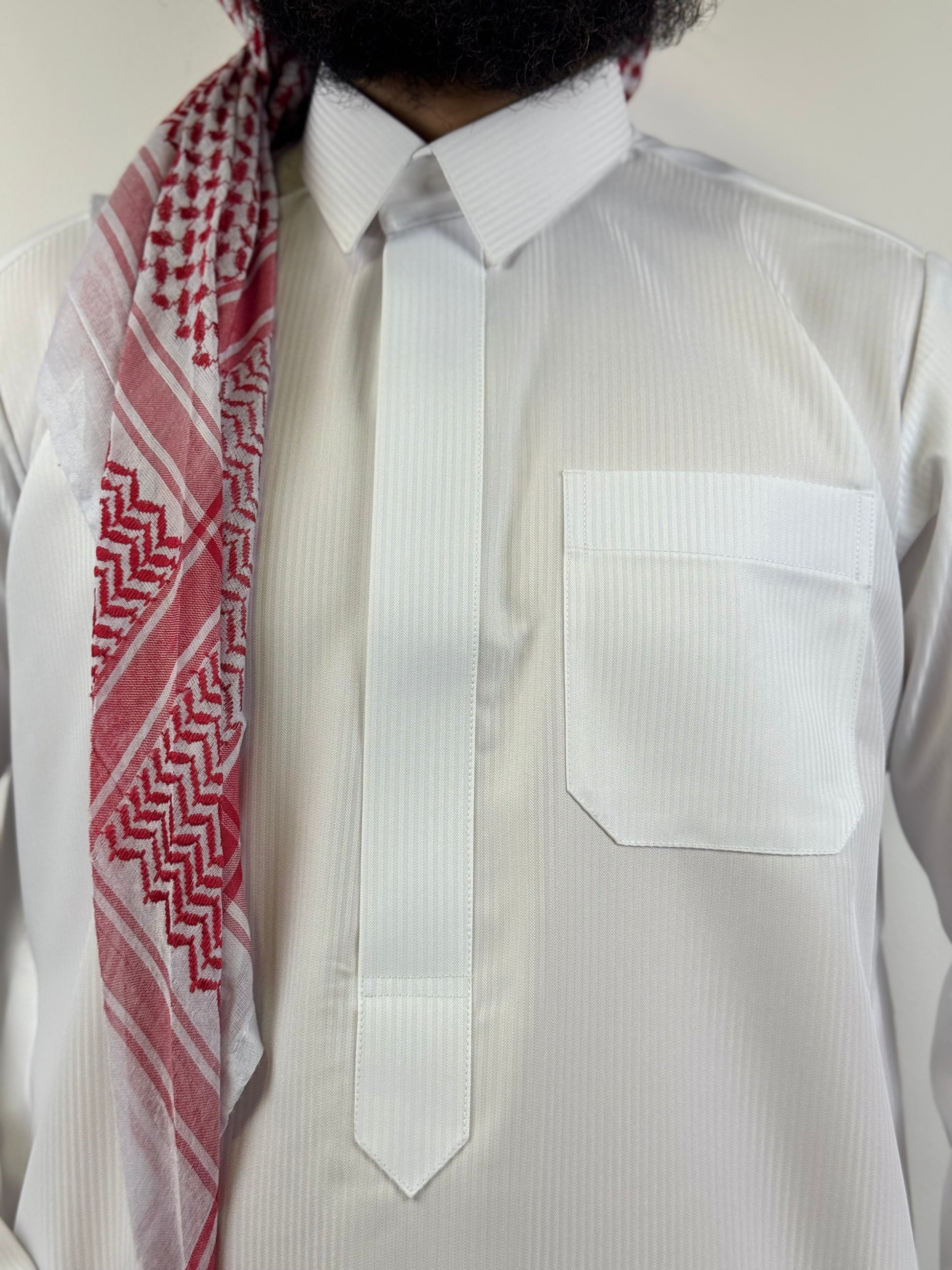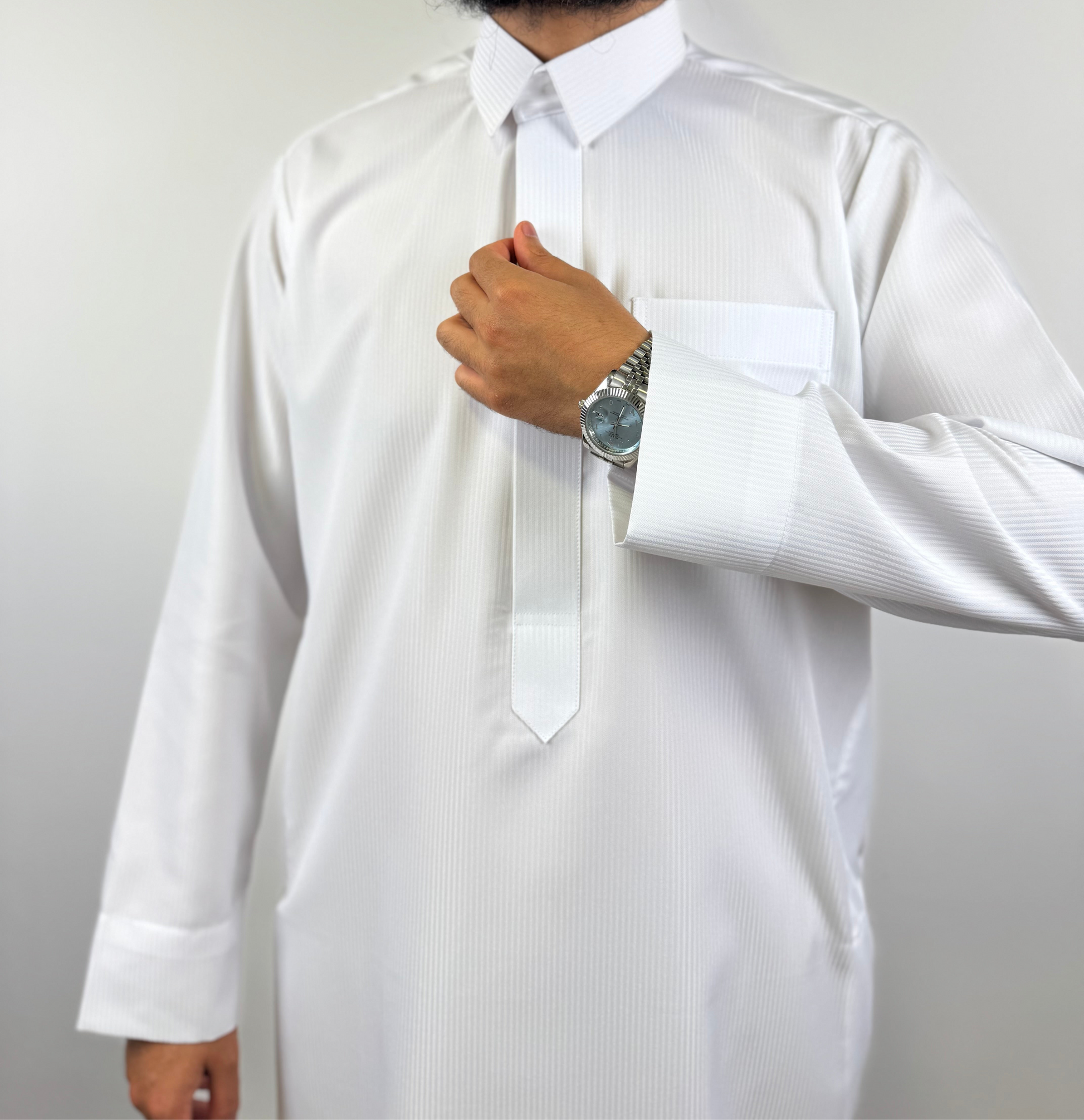 ✨ Un chef-d’œuvre de finesse et de sobriété, ce Qamis d’un blanc éclatant se distingue par ses rayures ton sur ton en léger relief. Subtiles mais visibles, elles apportent une touche de raffinement unique, pour ceux qui savent apprécier la beauté dans les détails.
