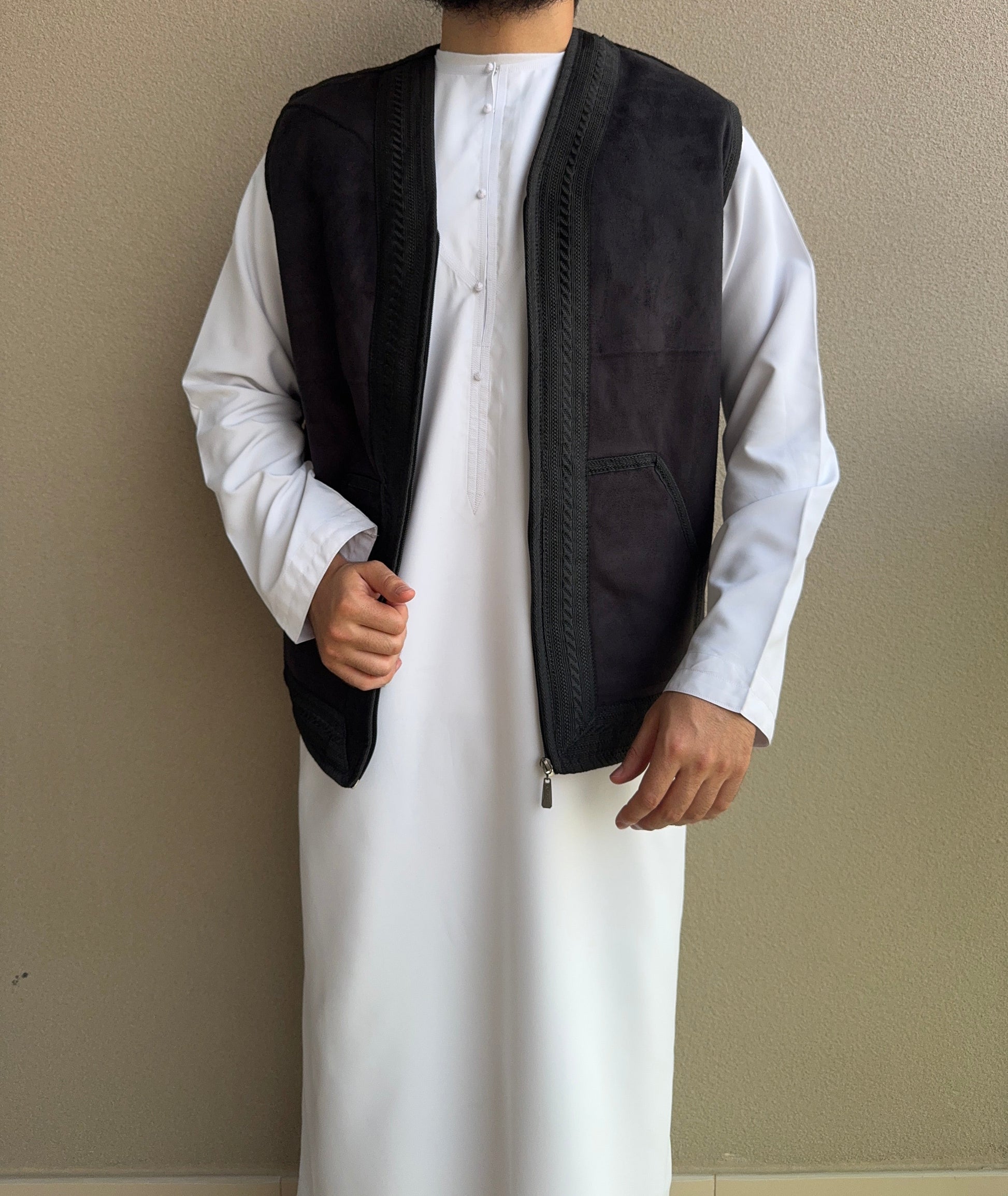 La Veste Al-Qudra Sans manches est conçue pour affronter l’hiver tout en conservant un style intemporel et moderne. Avec son design sans manches et sa doublure en fourrure, elle offre une chaleur optimale sans compromettre votre liberté de mouvement.